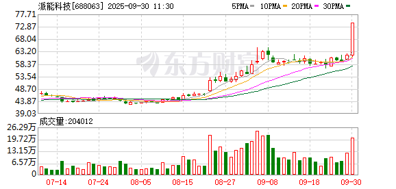 9月30日盘中科创板股派能科技涨停,截至11:13,股价报74.24元,成交13.95亿元,换手率8.14%,振幅21.24%。